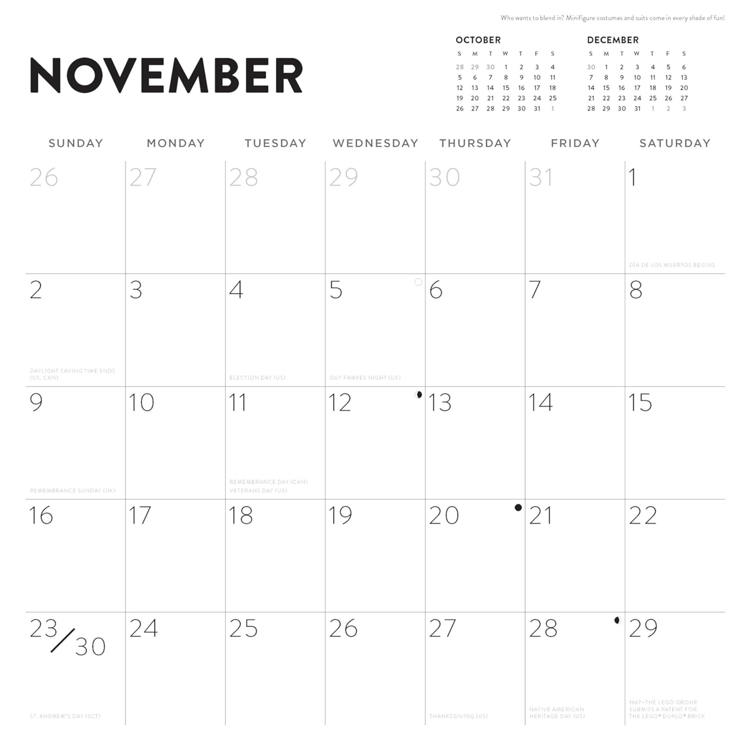 Month-to-view calendar – Measuring over 12 in. (30 cm) high and 12 in. (30 cm) wide, this easy-to-hang calendar celebrates each month with a burst of LEGO fun