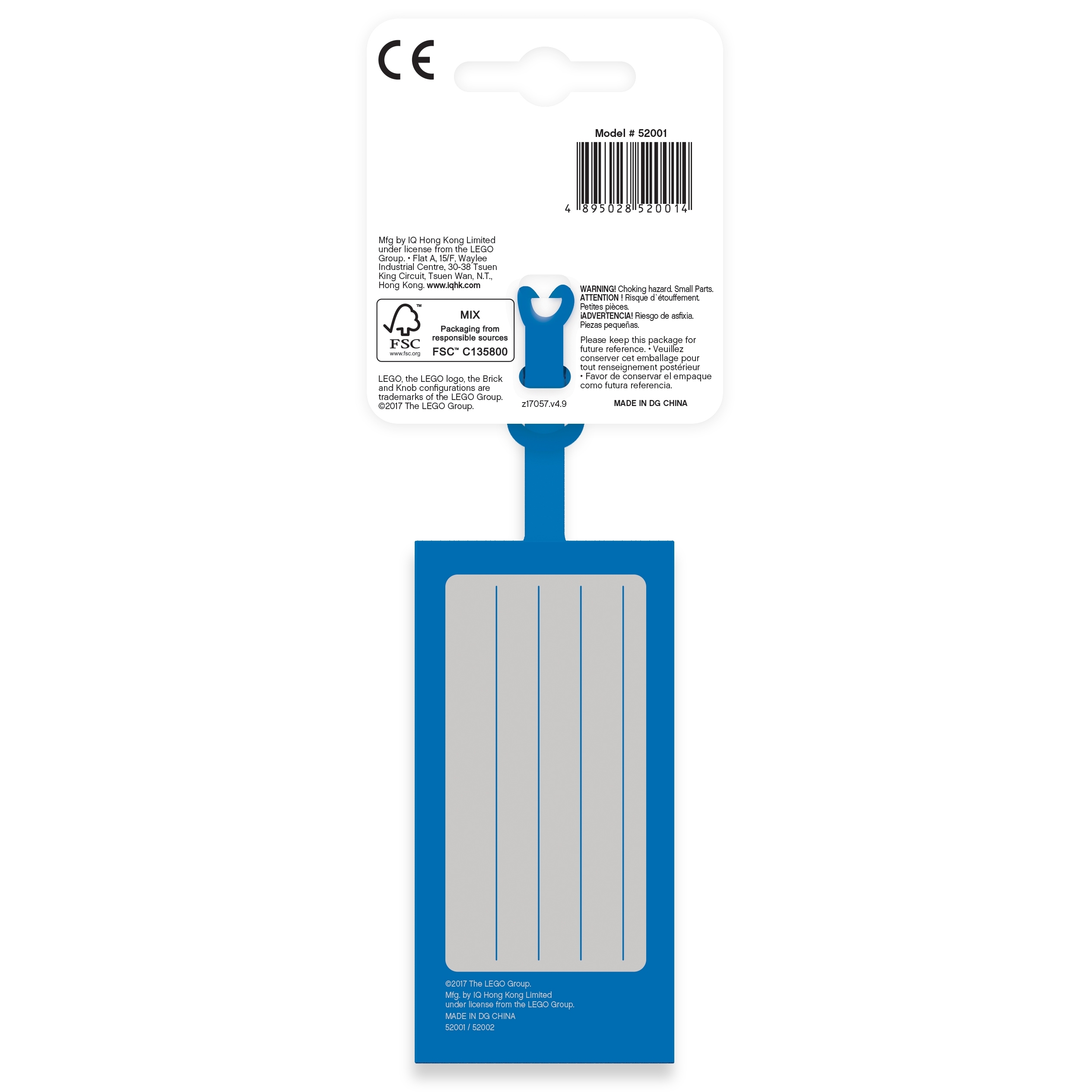 Features a silicone LEGO brick-style luggage tag with a strap and space on the back to add your personal contact information.