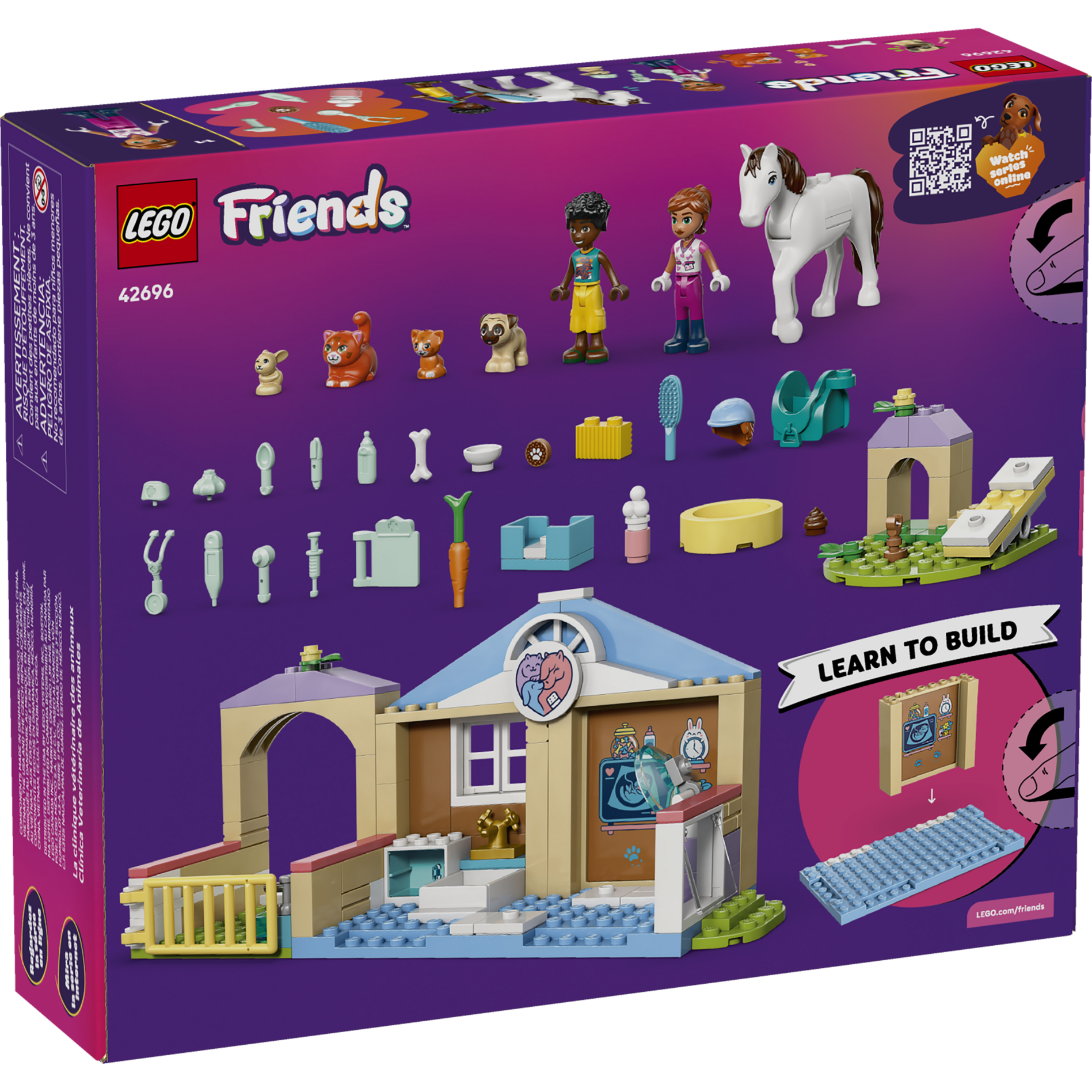This set makes a fun gift for preschoolers who love animal playsets. LEGO 4+ sets come withhelpful quick-start elements – larger pieces that help kids get started. With the LEGO Builder app, kids can enjoy a fun building experience where they can zoom in and rotate sets using 3D instructions and track progress. Set contains 141 pieces.”,”featuresText”:”Encourage kids ages 4 and up to build their own stories with the LEGO Friends Animal Vet Clinic (42696) playset for girls and boys. The detailed vet toy set is equipped with all your preschooler needs to role-play and care for the animals. There’s a horse stable, an examination room, pet beds, food, veterinary equipment, a pet playground and more.