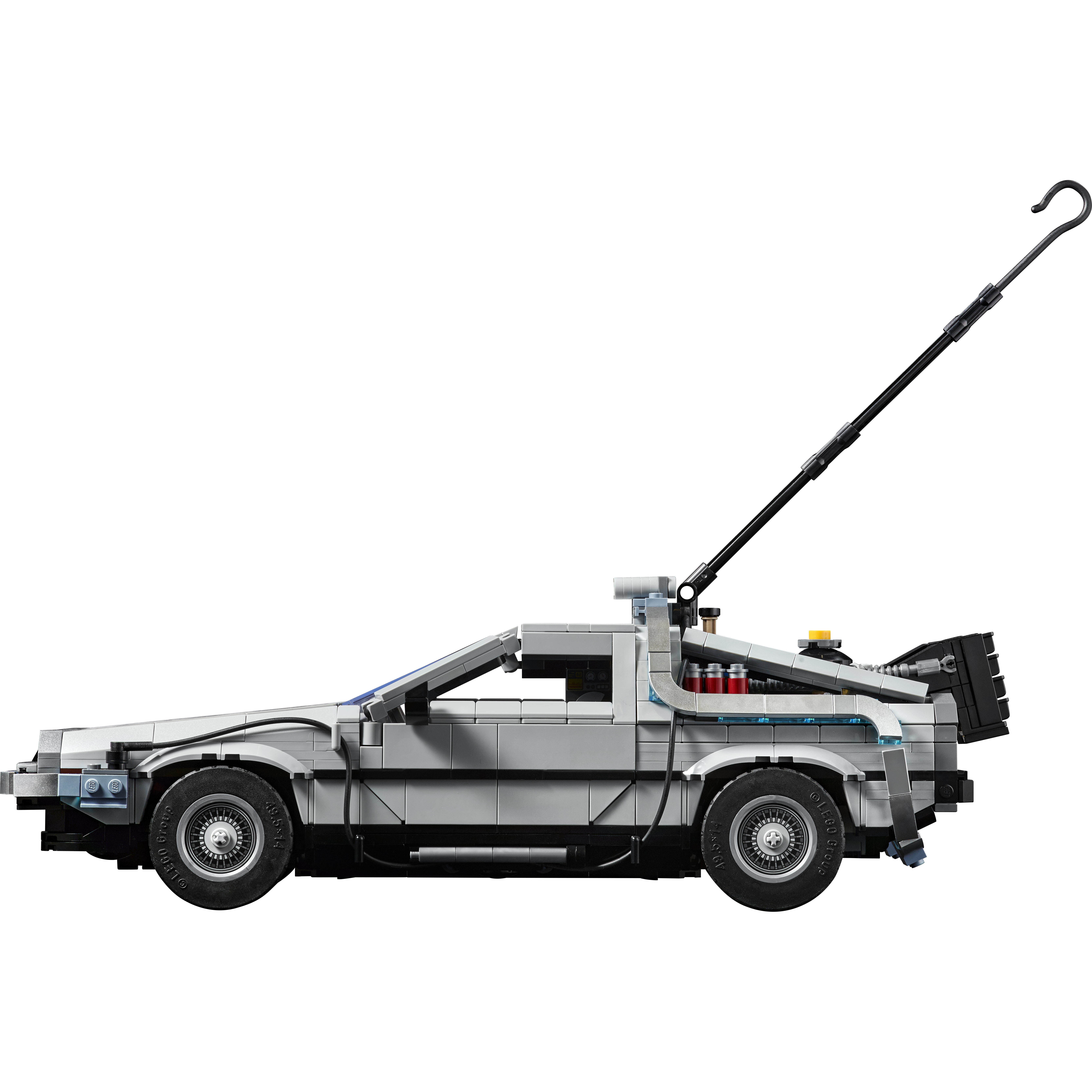 Flight mode – The car’s tires fold down for flight mode. Other details include the light-up flux capacitor, printed dashboard dates and opening hood