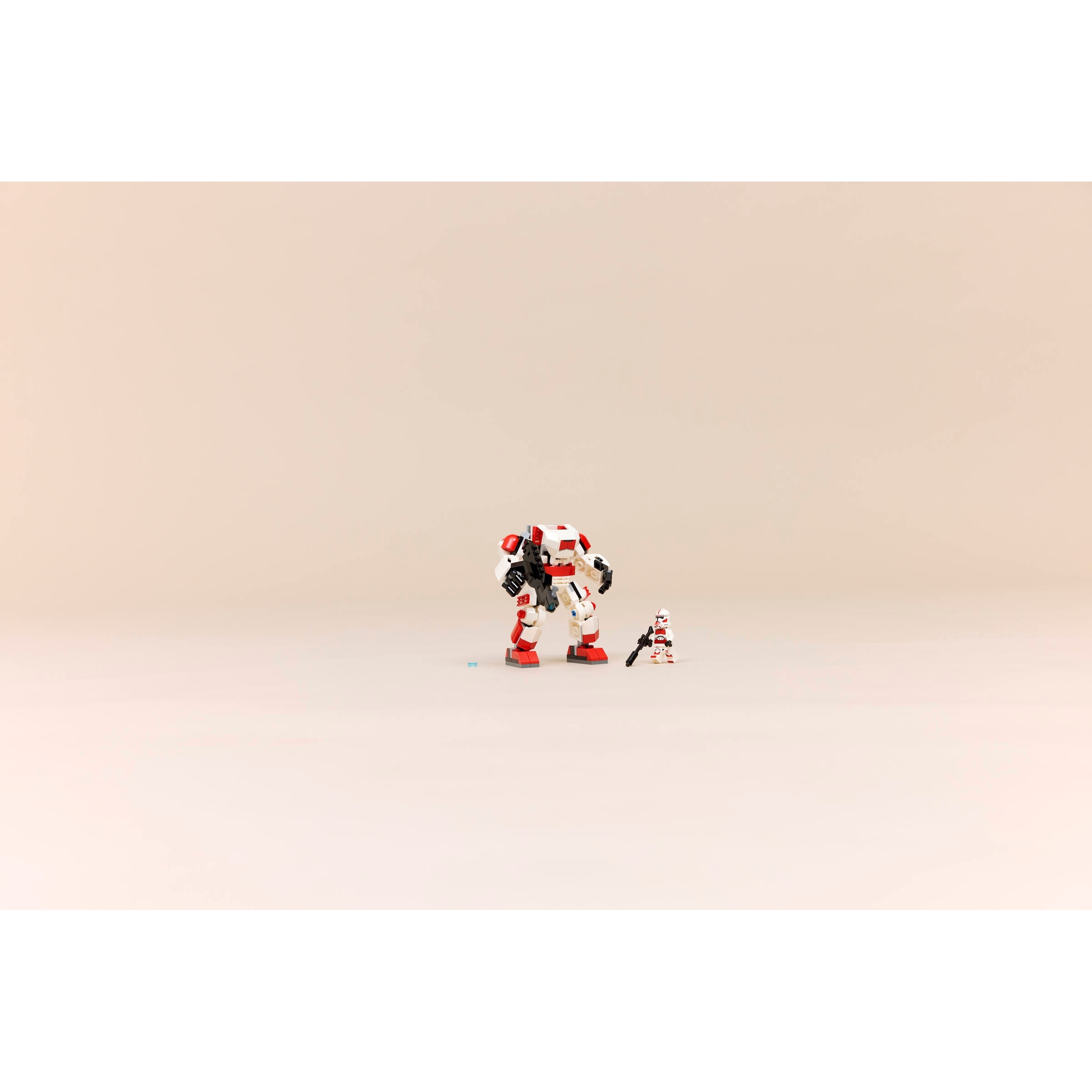 Put the Clone Shock Trooper LEGO minifigure in the mech’s cockpit and clip its blaster rifle to the back of the mech. Adjust the mechs arms, legs and feet to create battle poses. Place the large blaster rifle in its gripping hands and activate its stud shooter. With its armor in the distinctive red and white colors of Clone Shock Troopers, the mech also looks cool displayed in kids’ bedrooms between playtime missions.