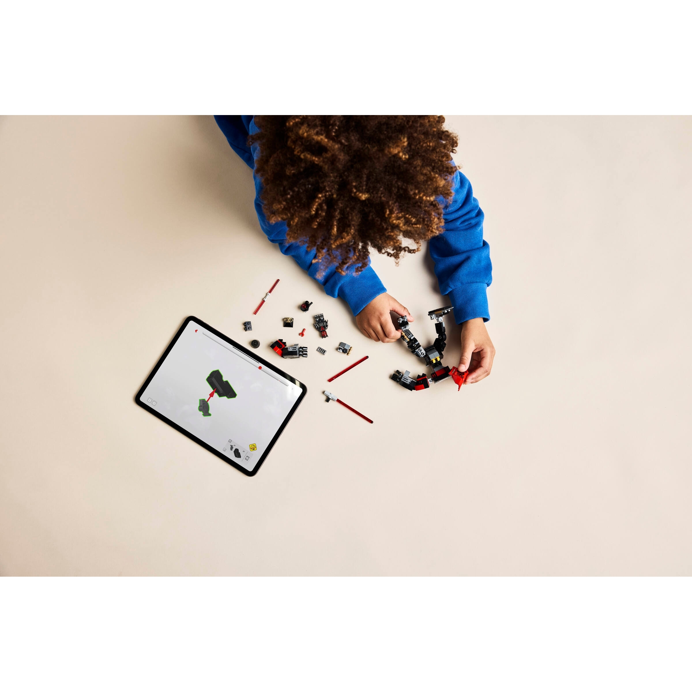 Buildable LEGO mech suit – The mech has posable hands, arms, legs and feet, an opening LEGO minifigure cockpit, plus a large double-bladed red Lightsaber