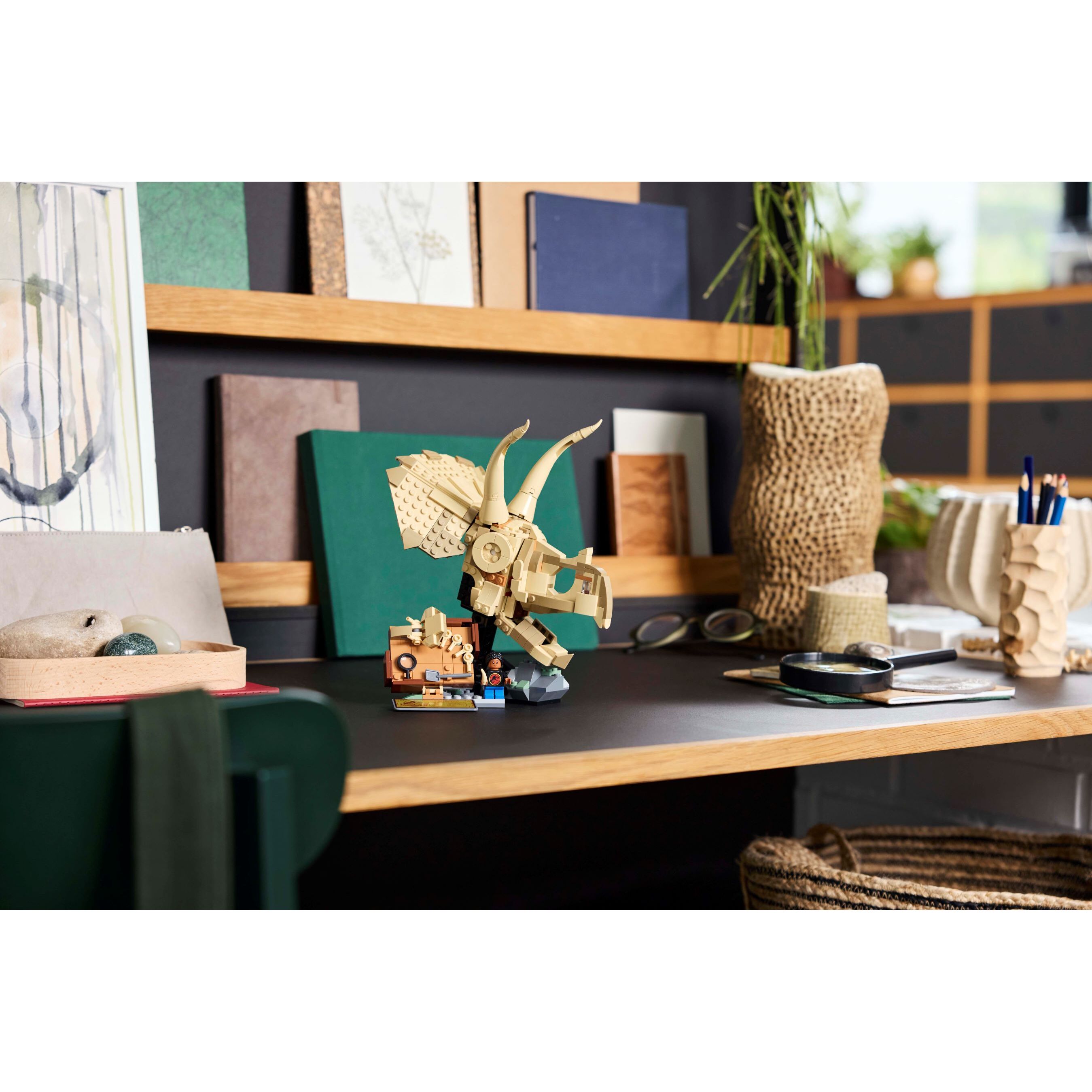 Dimensions – This 468-piece LEGO set includes a Triceratops skull on a stand that, together, measure over 8.5 in. (22 cm) high, 6.5 in. (17 cm) wide and 6.5 in. (17 cm) deep