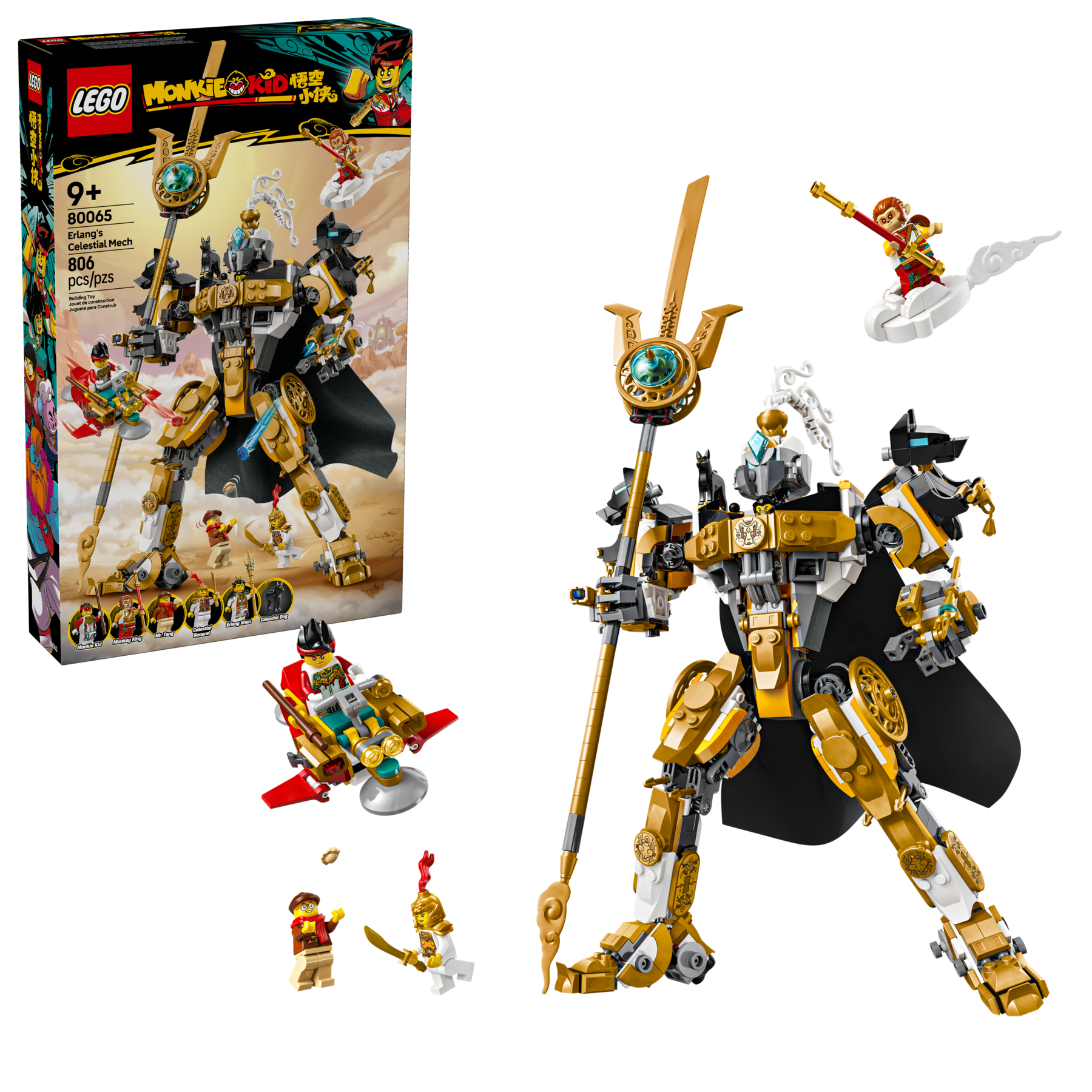 Mech action figure kids’ toy – LEGO Monkie Kid set features an articulated mech with cockpit, 2 stud shooters and spear, plus a hoverbike, ‘floating’ cloud, 5 minifigures and a Celestial Dog figure