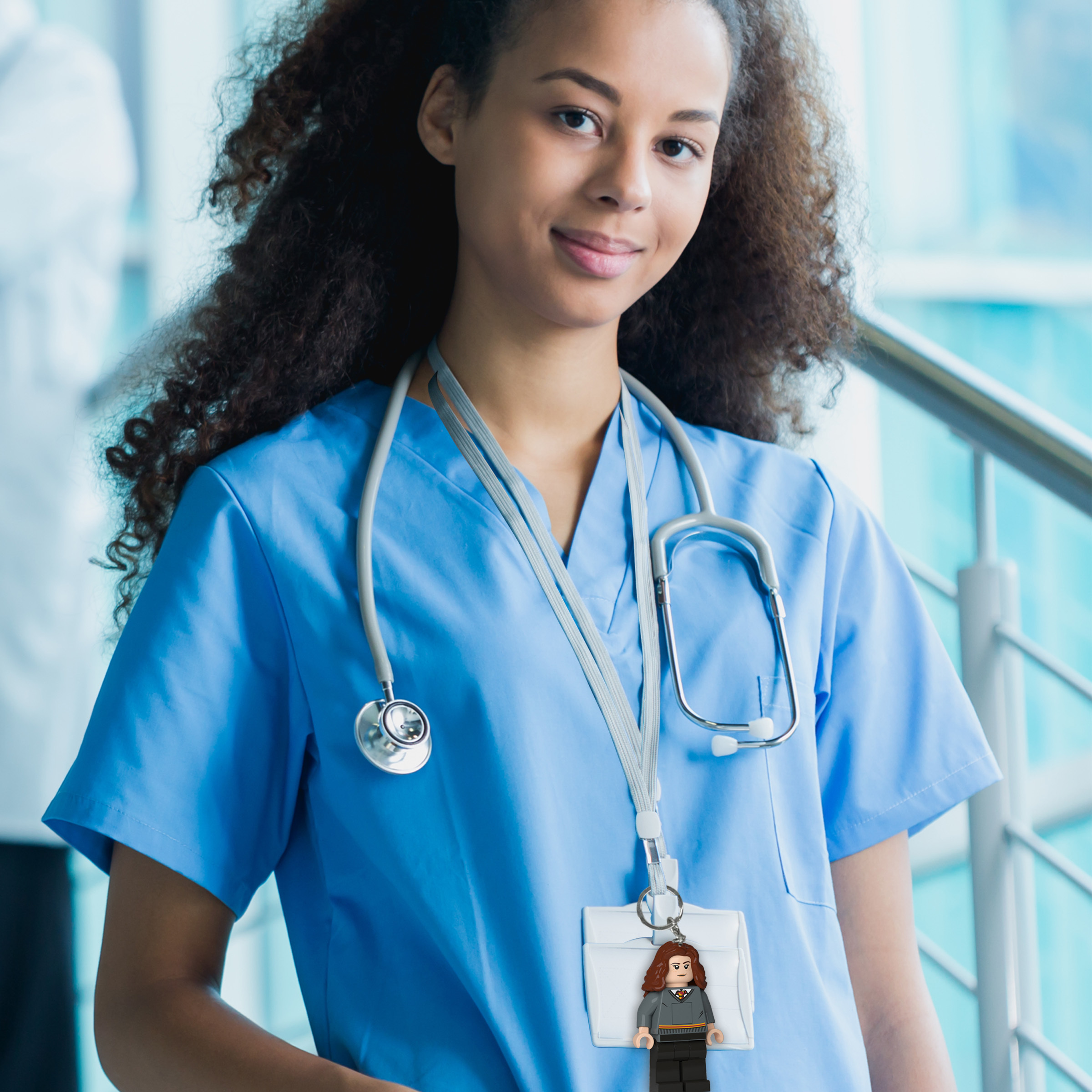 Hermione Granger Key Light – Features a large, posable Hermione Granger LEGO minifigure key fob with 2 bright LED lights in the feet, attached to a sturdy key ring and chain