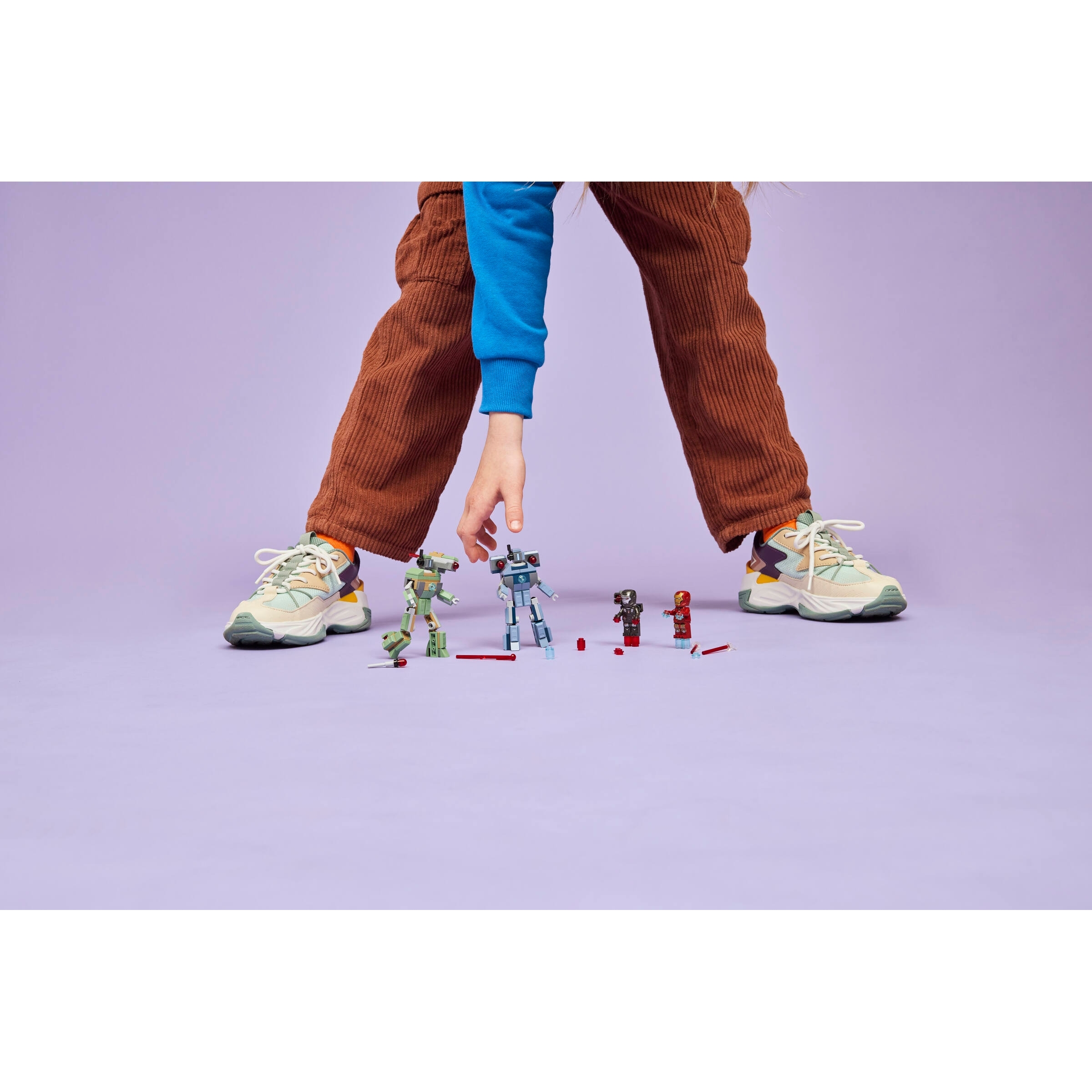 LEGO ǀ Marvel minifigures – Includes an Iron Man minifigure with blue hand and feet blasters and laser beam weapons and a War Machine minifigure with red hand and feet blasters and a stud shooter