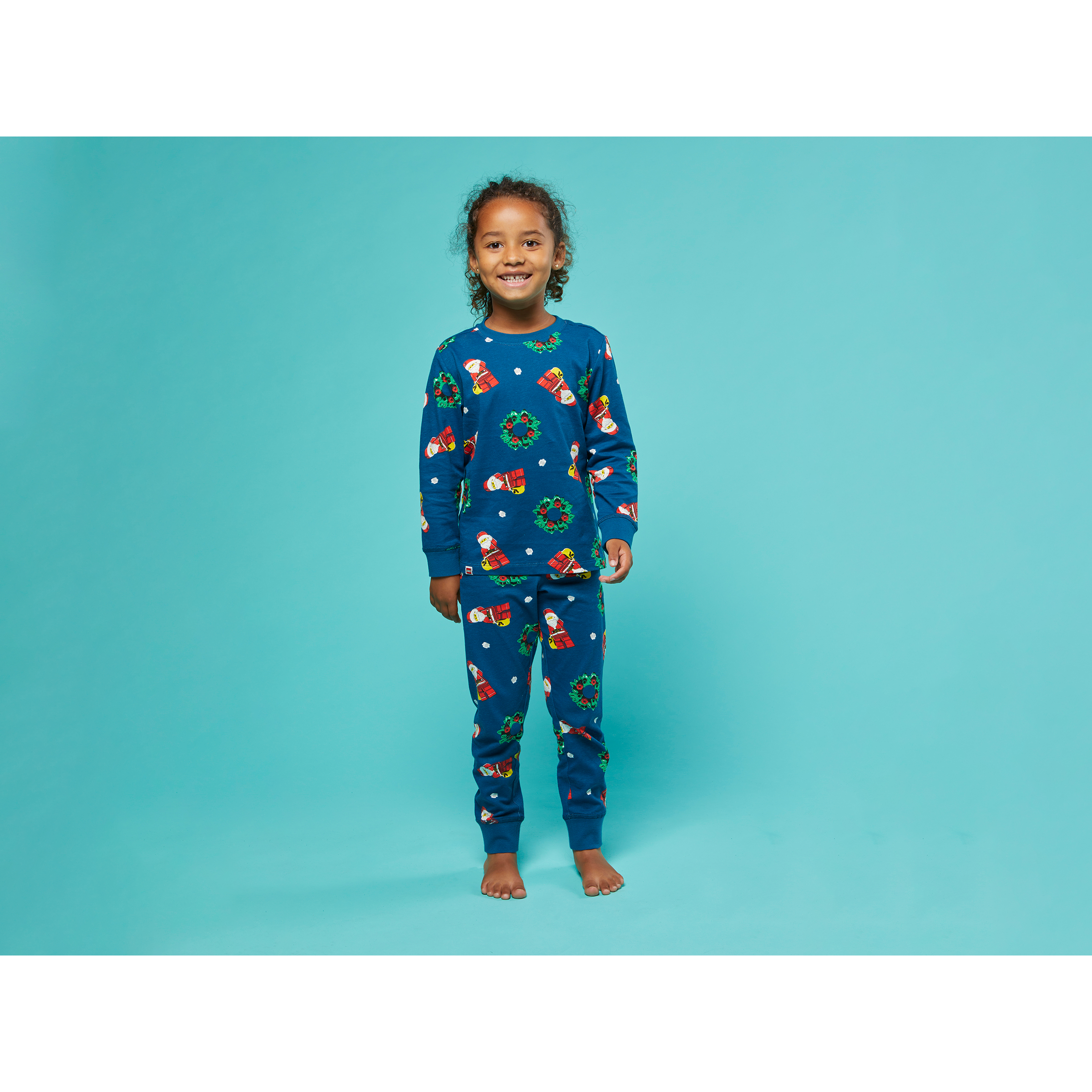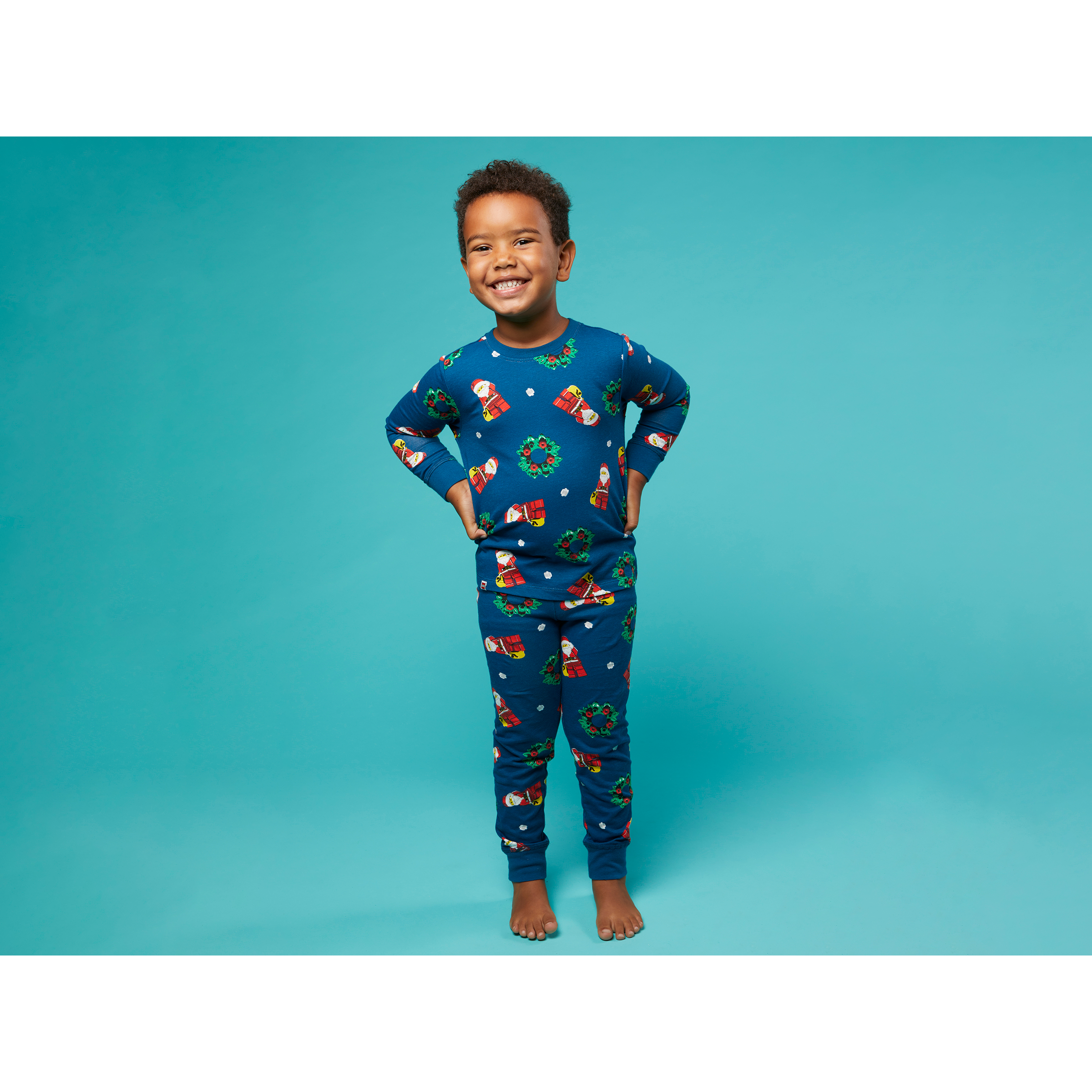 Holiday PJs for kids – Inspire happy dreams with LEGO Kids Pajamas – Navy, illustrated with Santa and Christmas wreath designs