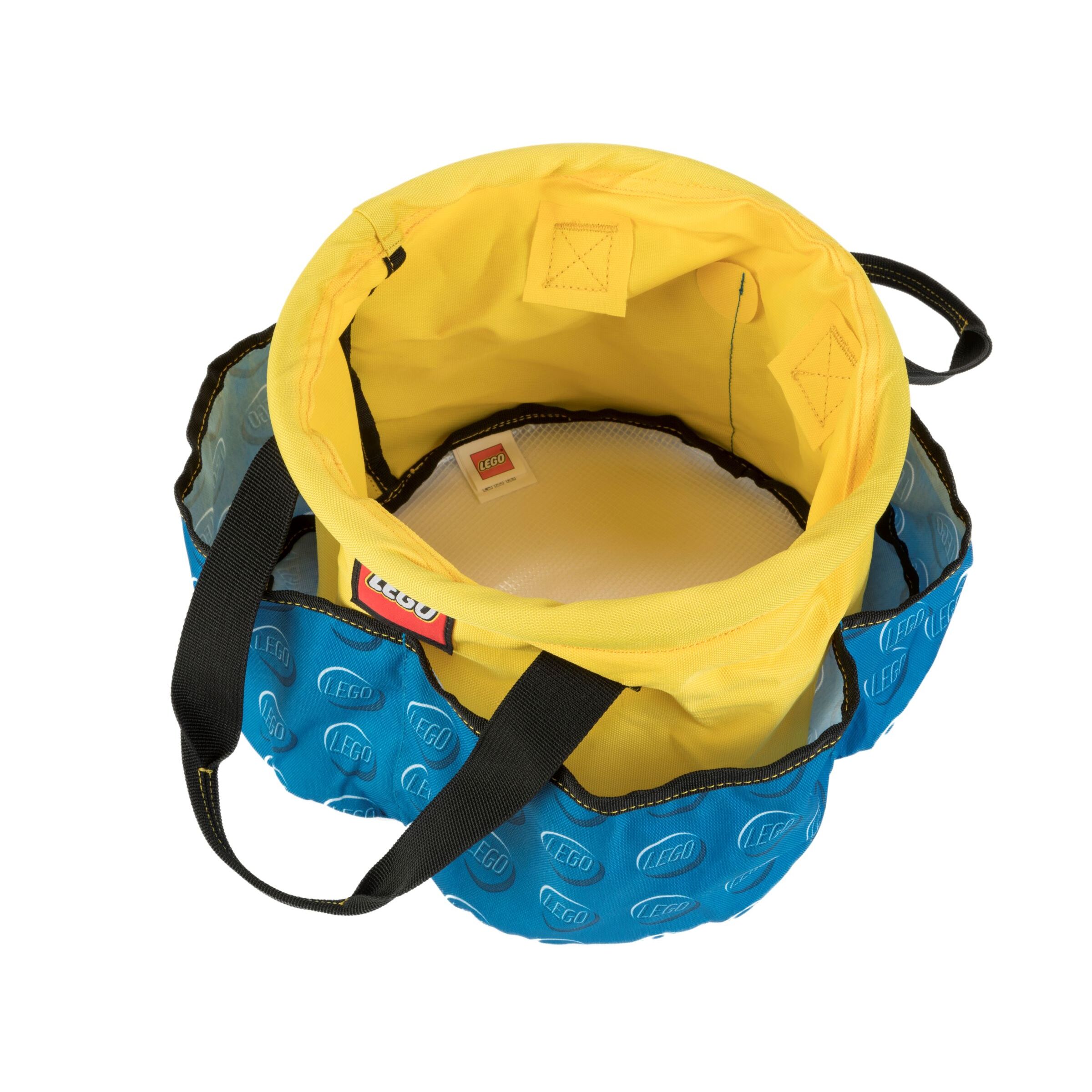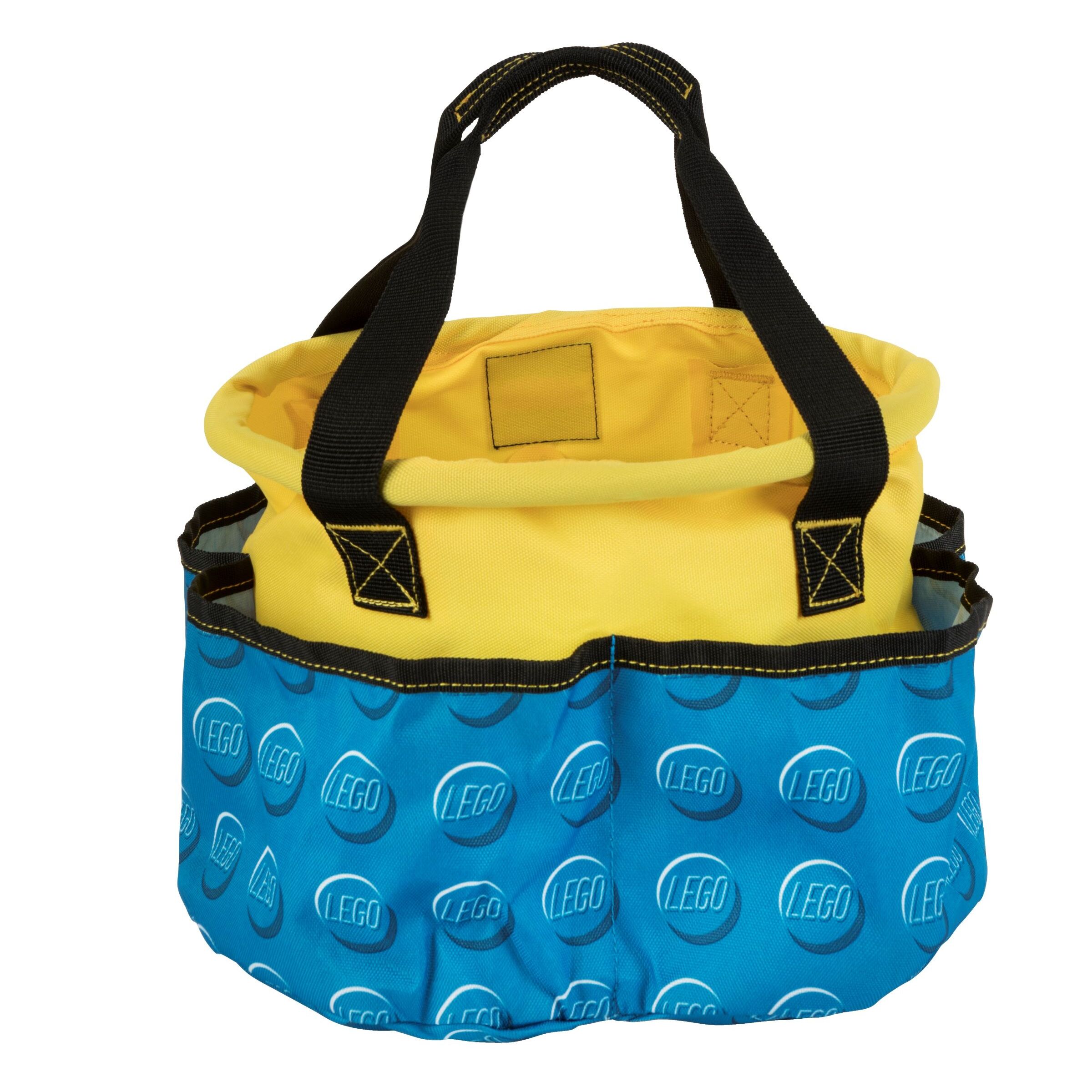 LEGO Iconic Storage Big Bucket featuring an open main compartment with a plastic ring sewn into the top seam for structure, 4 side pockets, sturdy handles and an easy-to-clean clear plastic base.