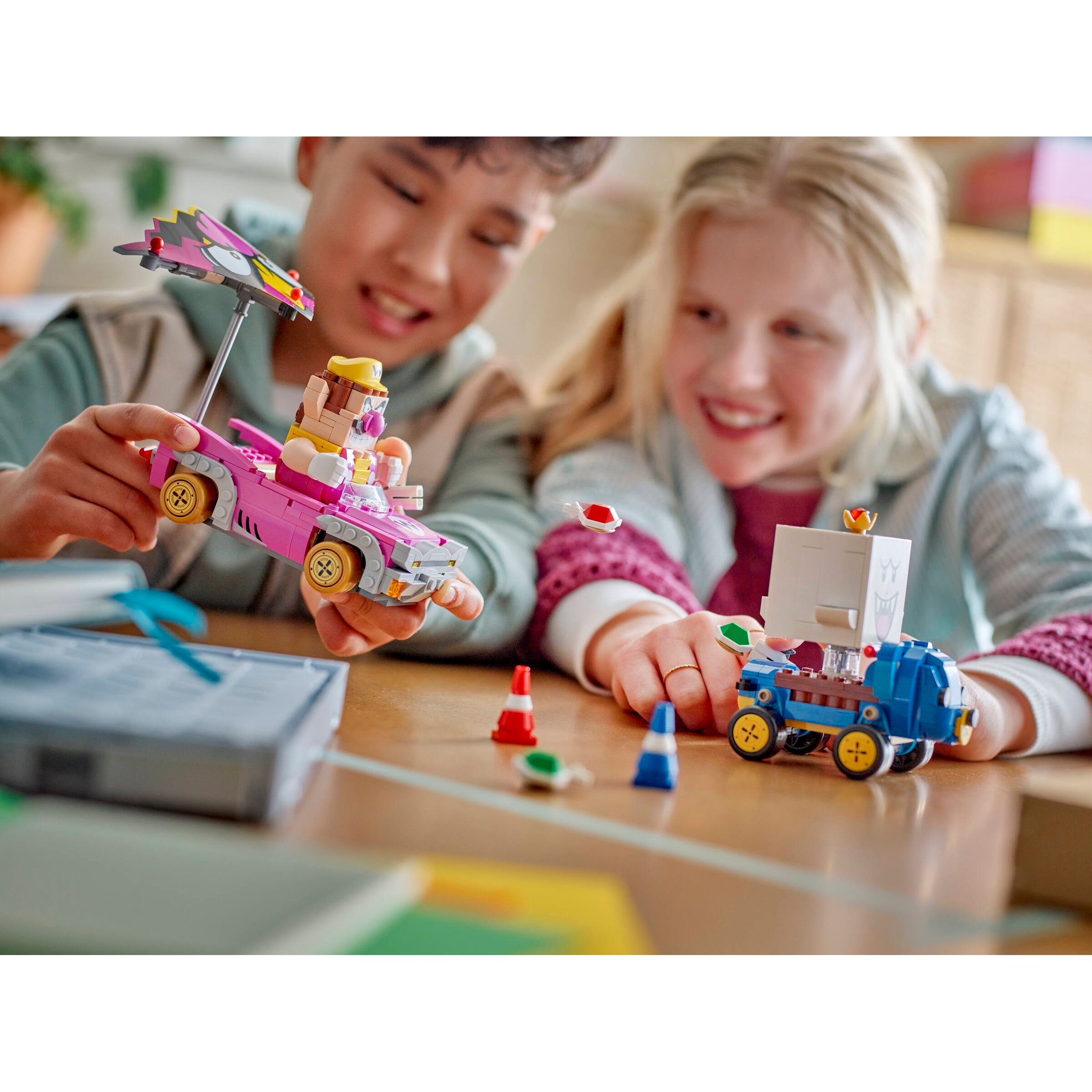 Brick-built Mario Kart toy races – Team up with Wario in the Badwagon and King Boo in the Teddy Buggy for shell-launching battles, drifting and gliding fun and traffic-cone-swerving races