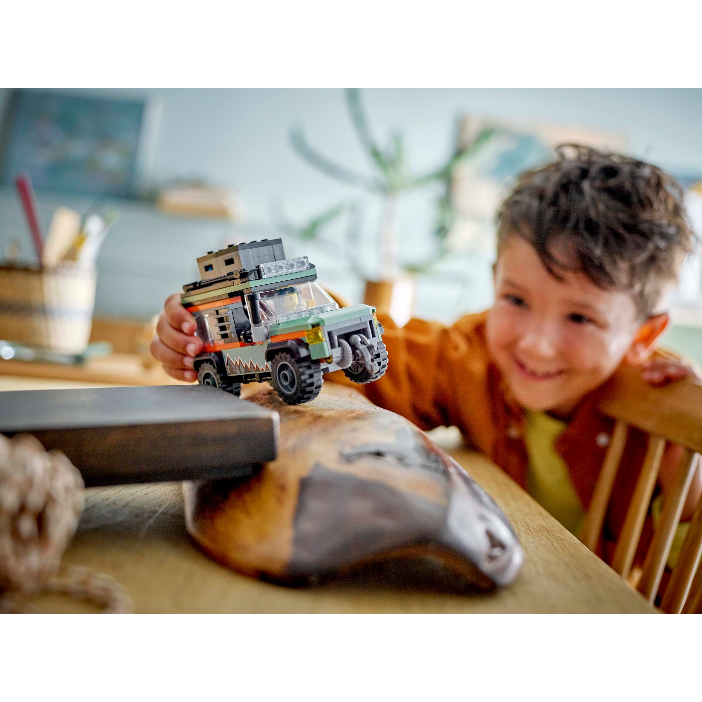 Vehicle set packed with LEGO minifigure accessories – Includes a toy camera, water bottle, flashlight, map, compass, binoculars, tools and a first aid kit for pretend play