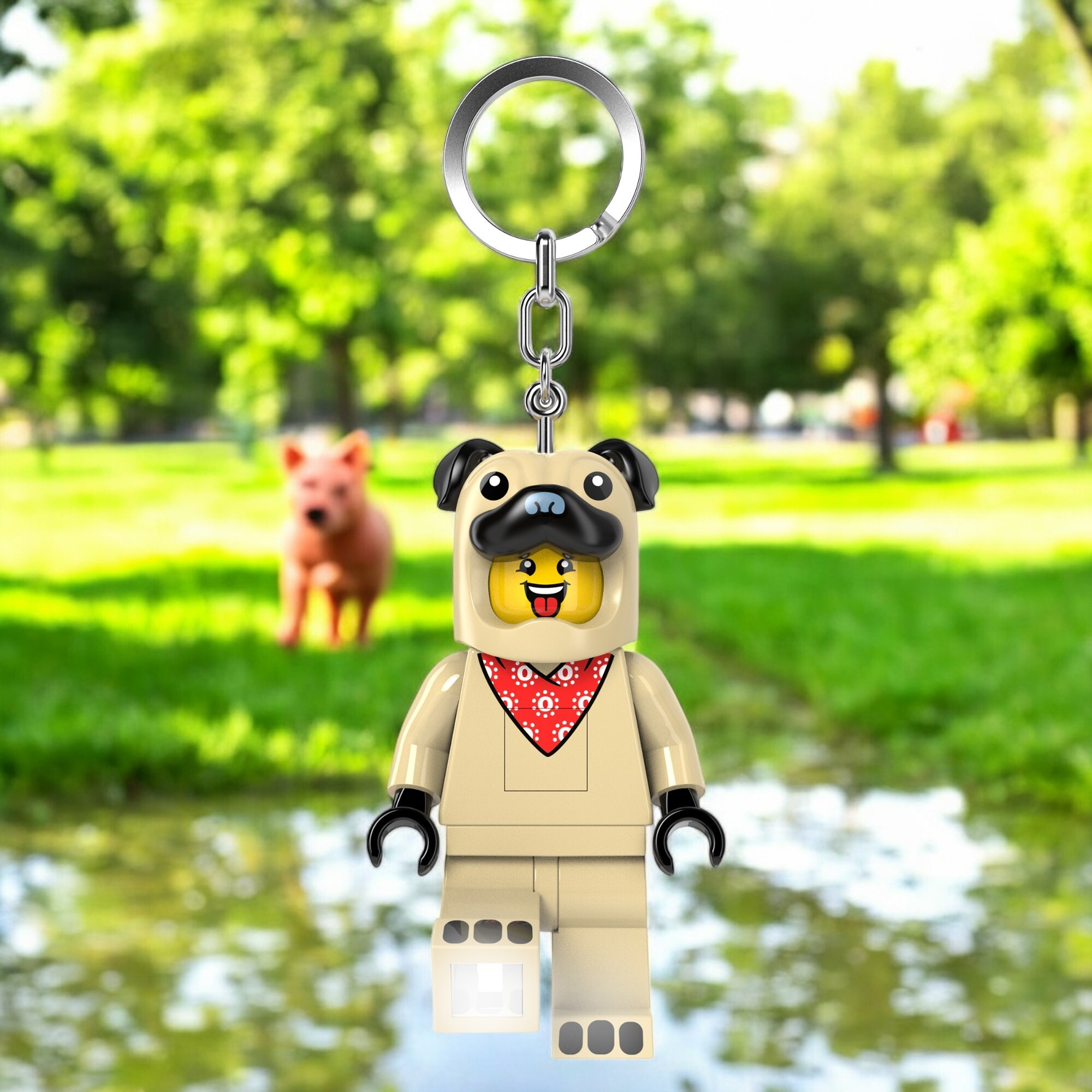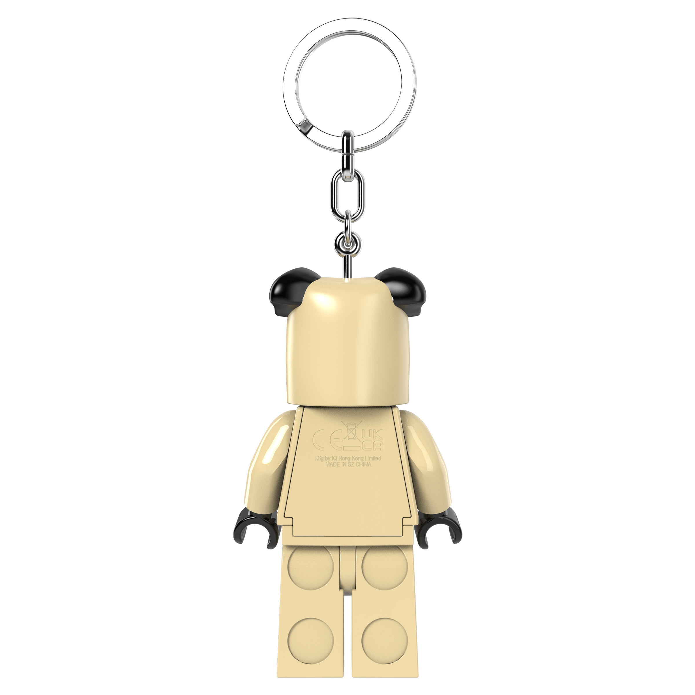 Handy LEGO accessory – This key light features a large, posable Pug Costume Guy LEGO minifigure, with 2 bright LED lights (batteries included) in the feet, attached to a durable keyring and chain