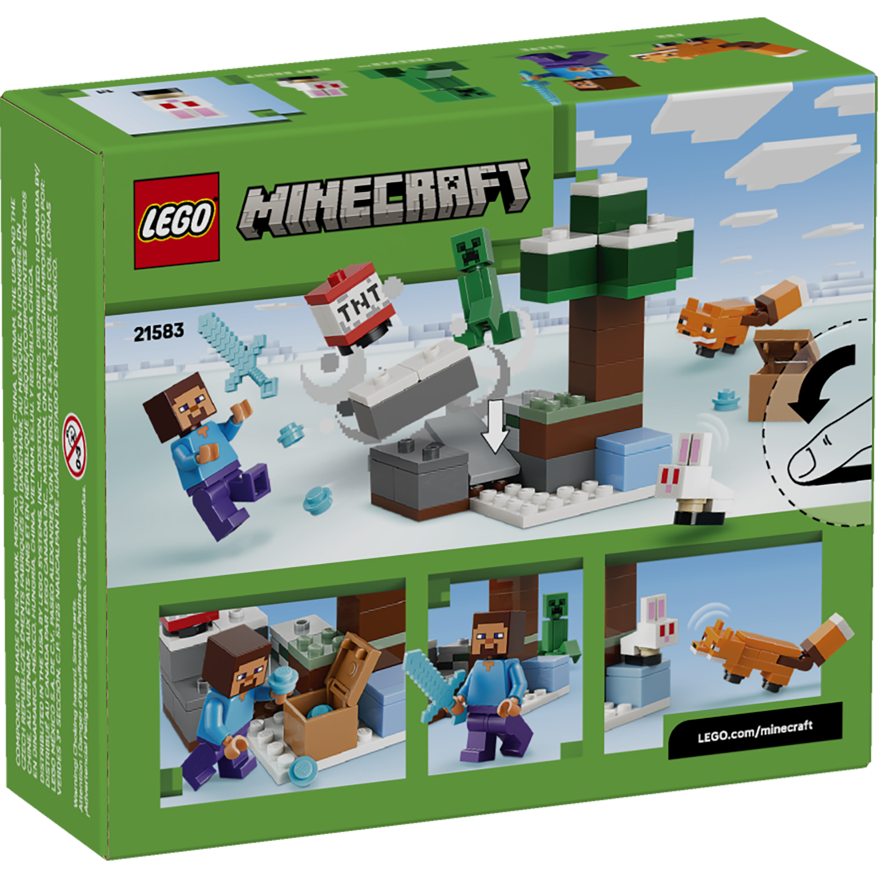 Kids join one of the game’s heroes, Steve, as he mines diamonds in the Minecraft taiga biome, with its distinctive spruce tree, snow and taiga grass. TNT and an explosion function blast the rocks apart to reveal diamonds, which can be stored in a treasure chest. There’s also a hostile Creeper to fend off using Steve’s diamond sword. This set makes a great gift idea for Minecraft players, LEGO builders and fans of gaming decor. And, with the LEGO Builder app, kids can build with confidence – zoom, rotate in 3D and track progress with easy-to-follow digital instructions. Set contains 79 pieces.”,”featuresText”:”Take Minecraft players’ gaming to the next level with Steve’s Taiga Adventure (21583), a collectible building set for boys and girls 6 years old and up. This small LEGO set is bursting with battle action, treasure hunting and explosive fun for kids to explore with a Steve minifigure, plus a Creeper, fox and a baby bunny LEGO figures.