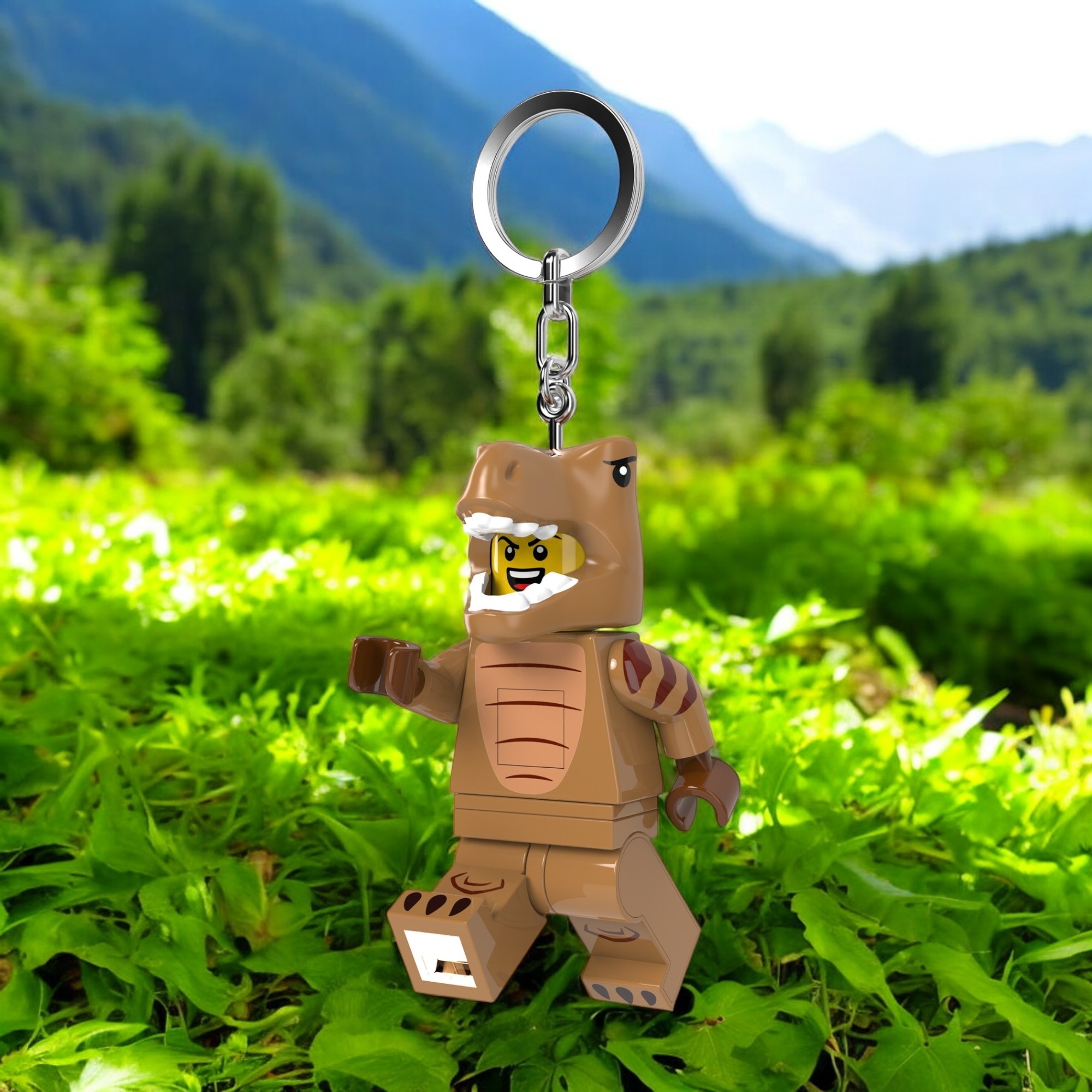 Dinosaur accessory for ages 6 and up – This key light features a large, posable T. rex Costume Fan LEGO minifigure, with 2 bright LED lights (batteries included) in the feet