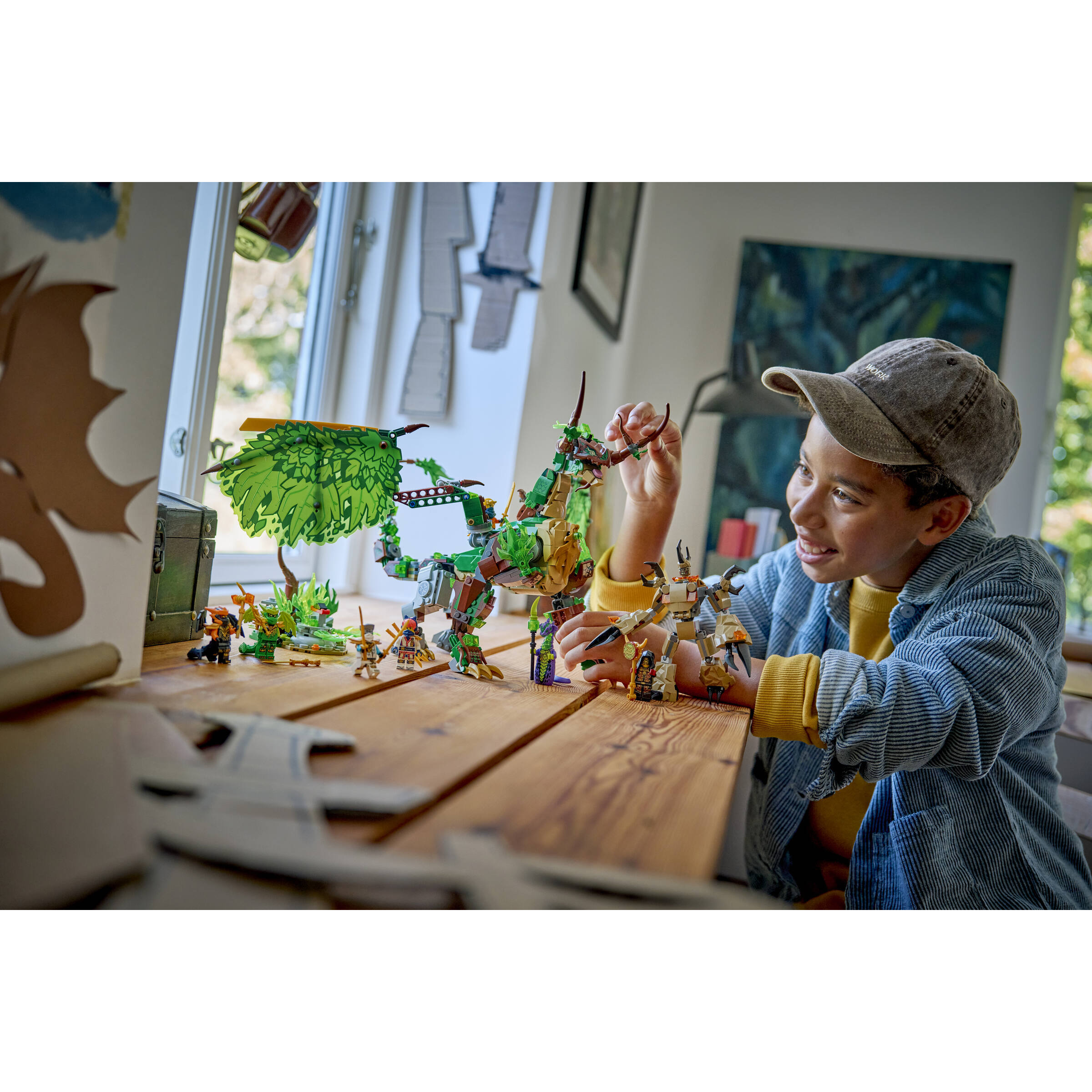 The playset includes a side build with a tree and a plant kids can spin around that hides a golden sword accessory, plus a posable mini mech toy with a cockpit for a minifigure. To role-play epic battles, there are 8 minifigures: ninja Zane, Sora, Arin, dragon form Lloyd and dragon form Cole and the villainous trio of Acid Monster, Earth Monster and Loyalist Leader.