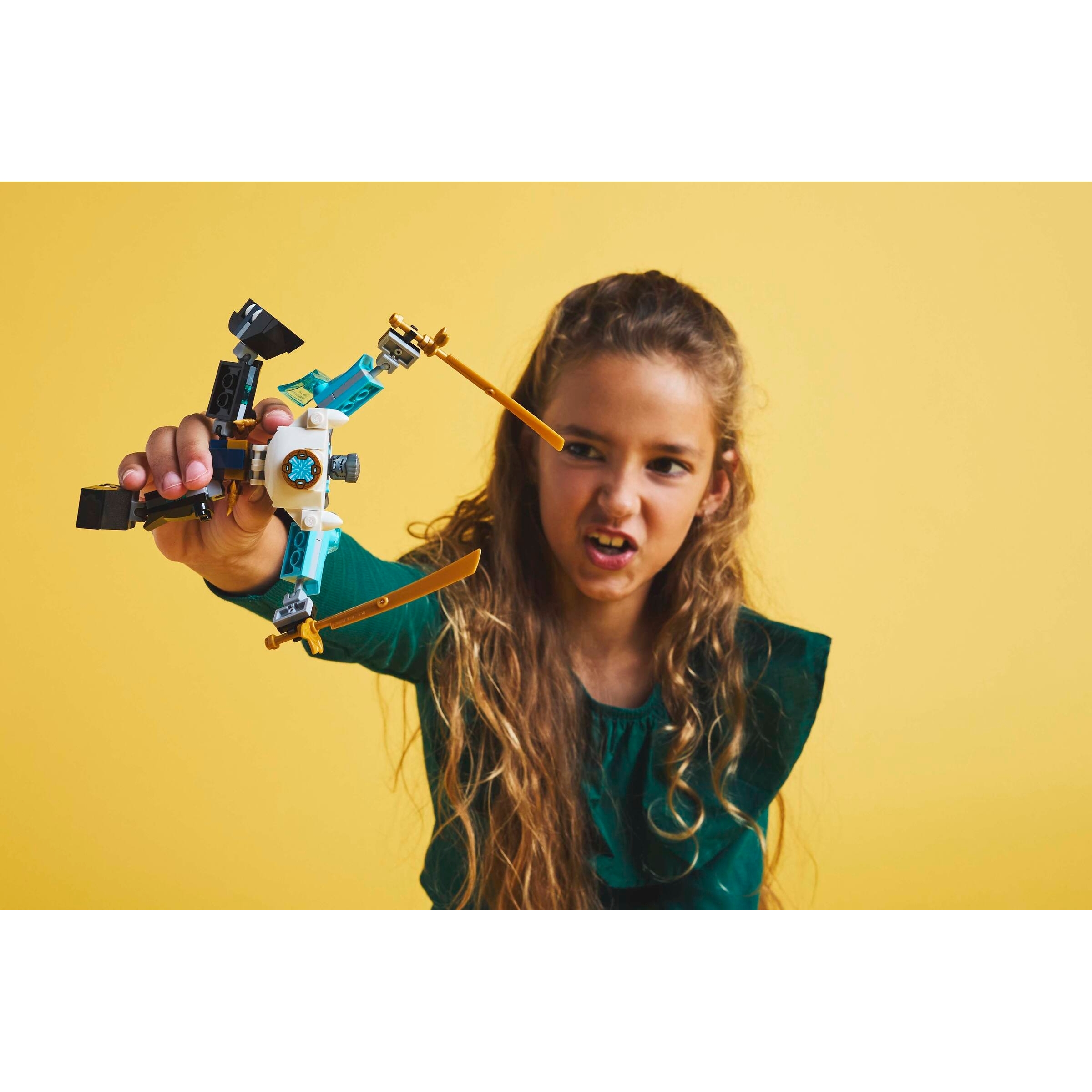 Posable mech toy – Zane’s Battle Suit Mech has posable arms, legs and hands, an upper body that rotates through 360 degrees, an opening chest to place a minifigure inside and 2 big sword accessories